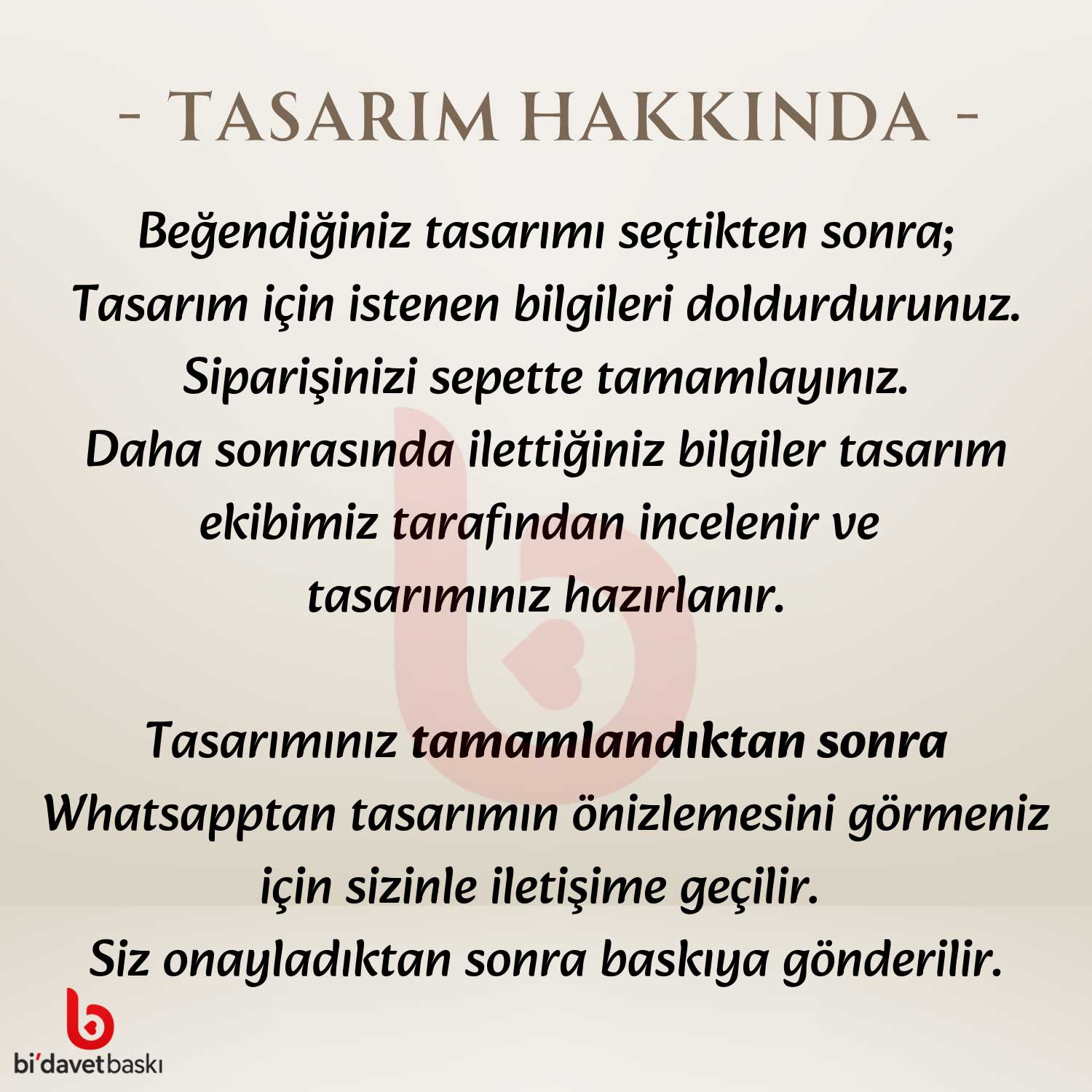 Sipariş süreci oldukça kolay ve güvenlidir. Beğendiğiniz tasarımı seçtikten sonra sipariş oluşturmadan önce sizden istenen bilgileri (isim, yaş, tarih vb.) doldurarak siparişinizi tamamlayabilirsiniz. Ardından Bi Davet Baskı tasarım ekibi, ilettiğiniz bilgilere göre tasarımı özenle hazırlar. Hazırlanan tasarımın ön izlemesi size WhatsApp üzerinden gönderilir. Müşteri onayı alındıktan sonra ürün baskıya alınır ve üretim süreci başlatılır.